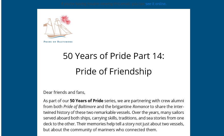 The Pride of Baltimore blog is out NOW, featuring the connection of Romance and Pride.