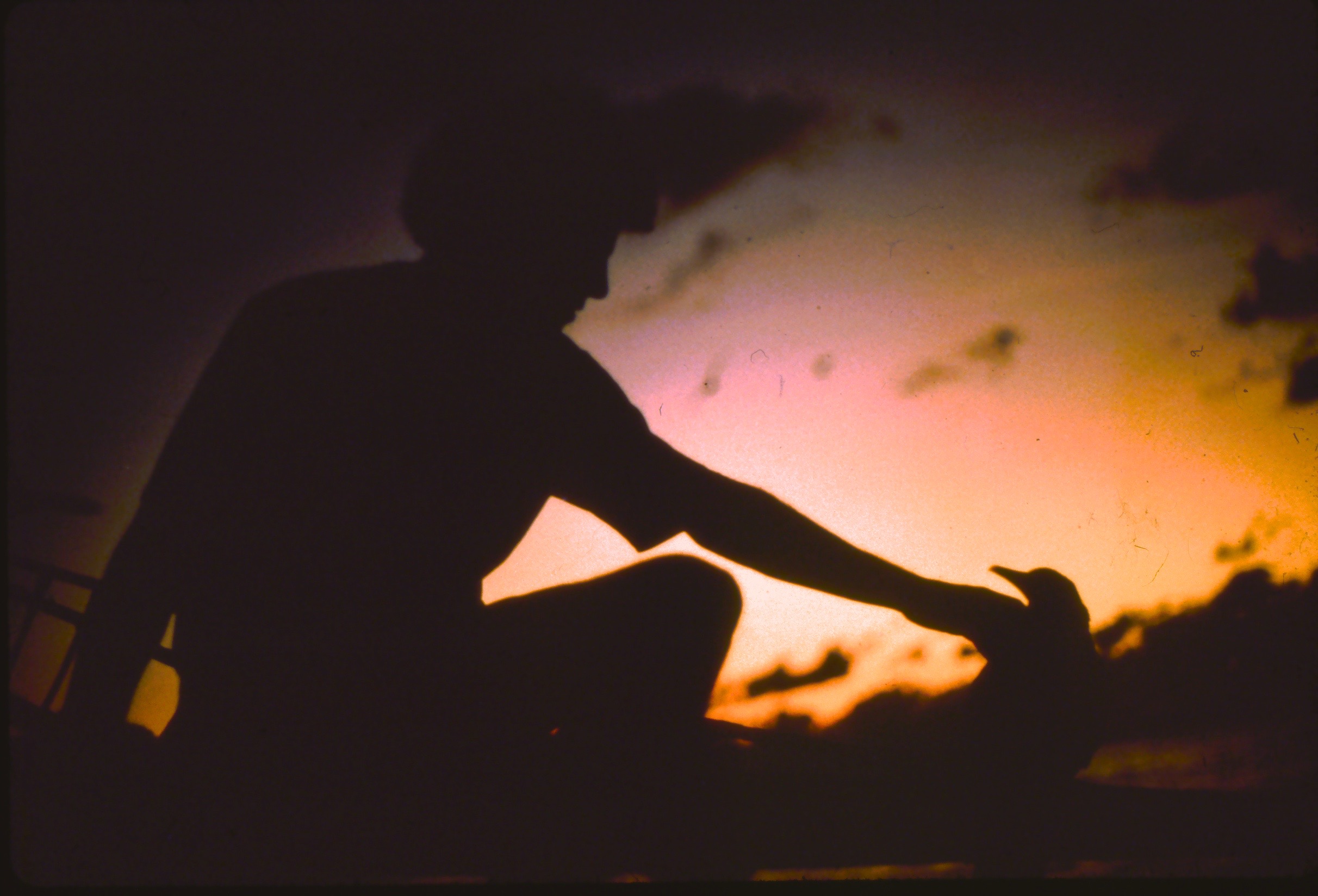 went ashore on Prickly Pear to cut a traditional Virgin Islands' Christmas Tree: Century Plant Flower, brought it aboard. I had much more hair back then!"